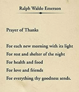 Emerson’s “Prayer of Thanks” is simple and much like the Lord’s prayer, it’s an easy one for me to recall and I often find myself silently reciting it as I consider just how lucky I’ve been in life. Thank you, dad.
