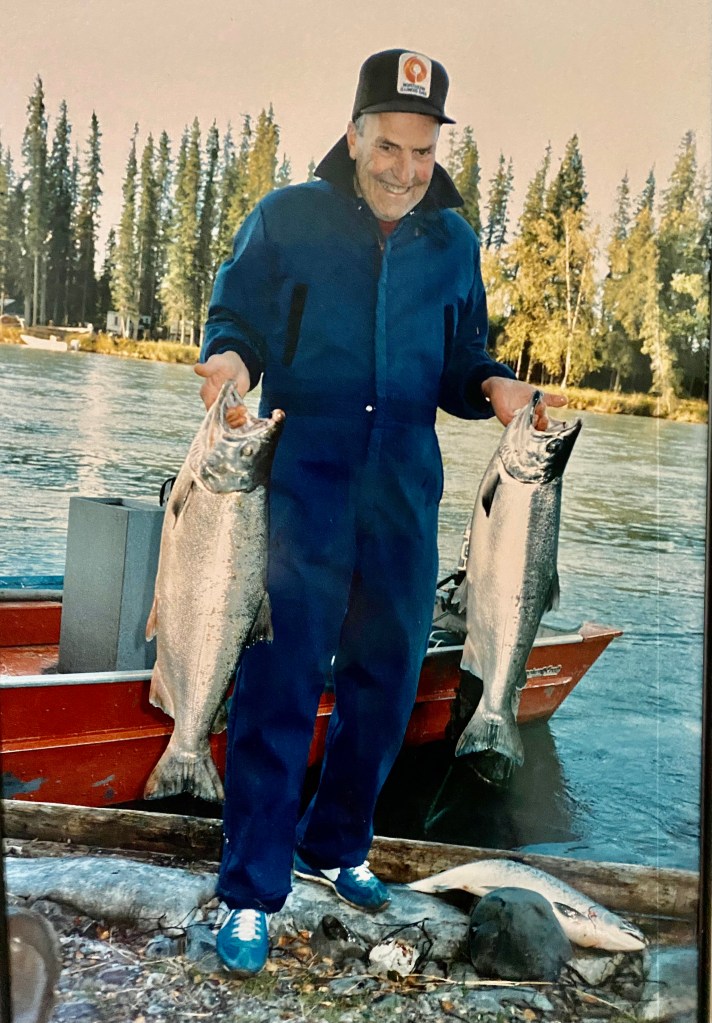 My father-in-law Joe was a great guy. Yep – he was a fisherman. Snipped in above is our all-time favorite pic of him – proudly displaying his catch in Alaska many years ago. He passed away in 1999 but this giant portrait hangs in hubby’s office to help us remember Joe well.