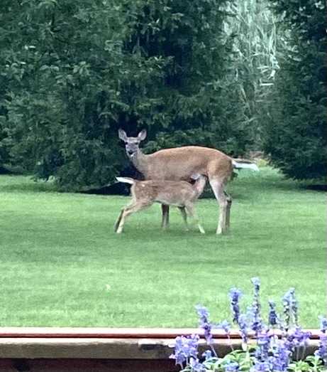 I spied…mama and baby deer this morning and I was shocked by how much “baby” has grown (first pic). The second photo (sorry for the grainy-ness through the screen) was taken just a couple of weeks ago when I wrote about my favorite twosome. Baby’s sweet markings and slight physique were obvious then…less so today.
