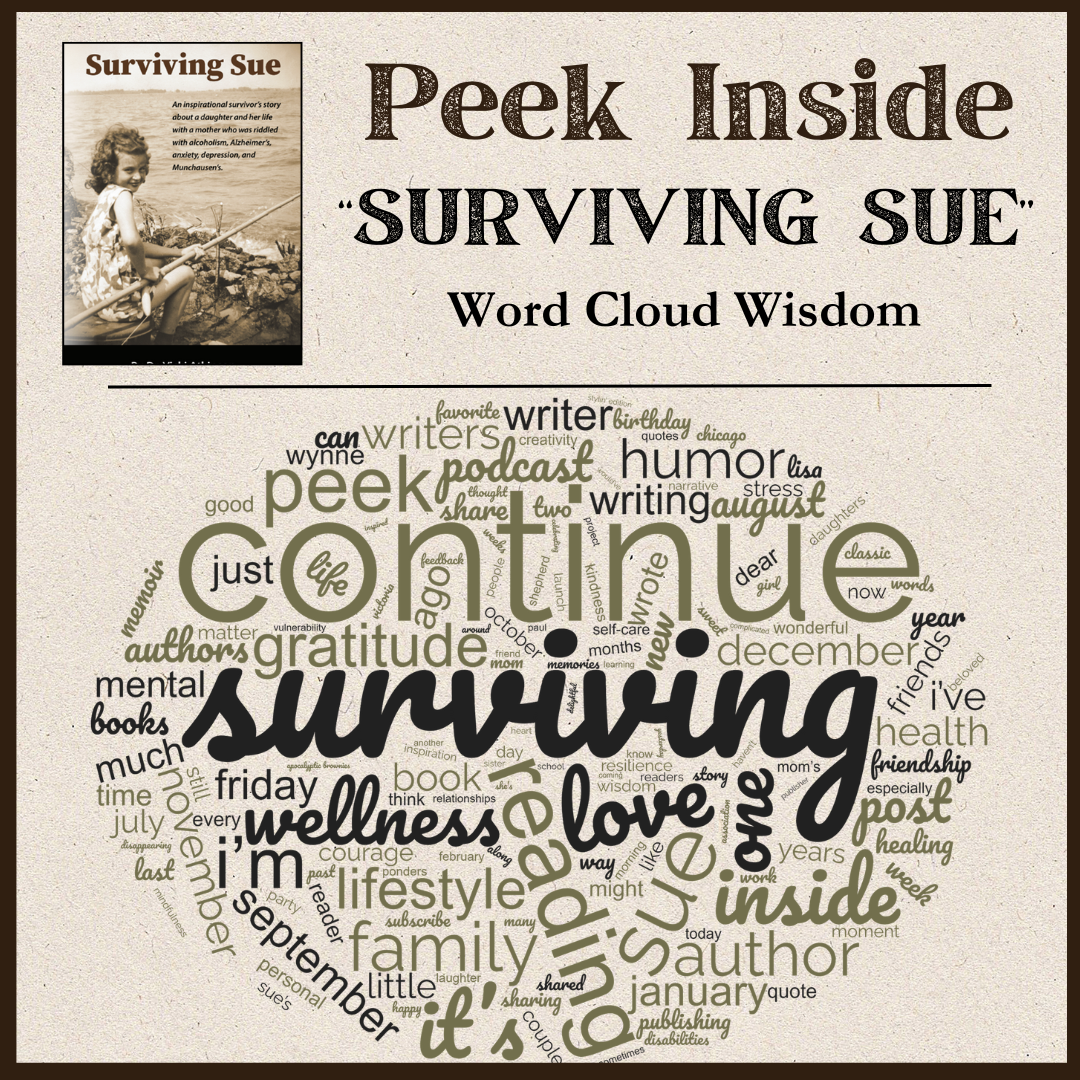 I received a terrific question from a reader recently, asking if I ever wondered what a visual representation of “Surviving Sue” would look like if I created a Word Cloud from it.
