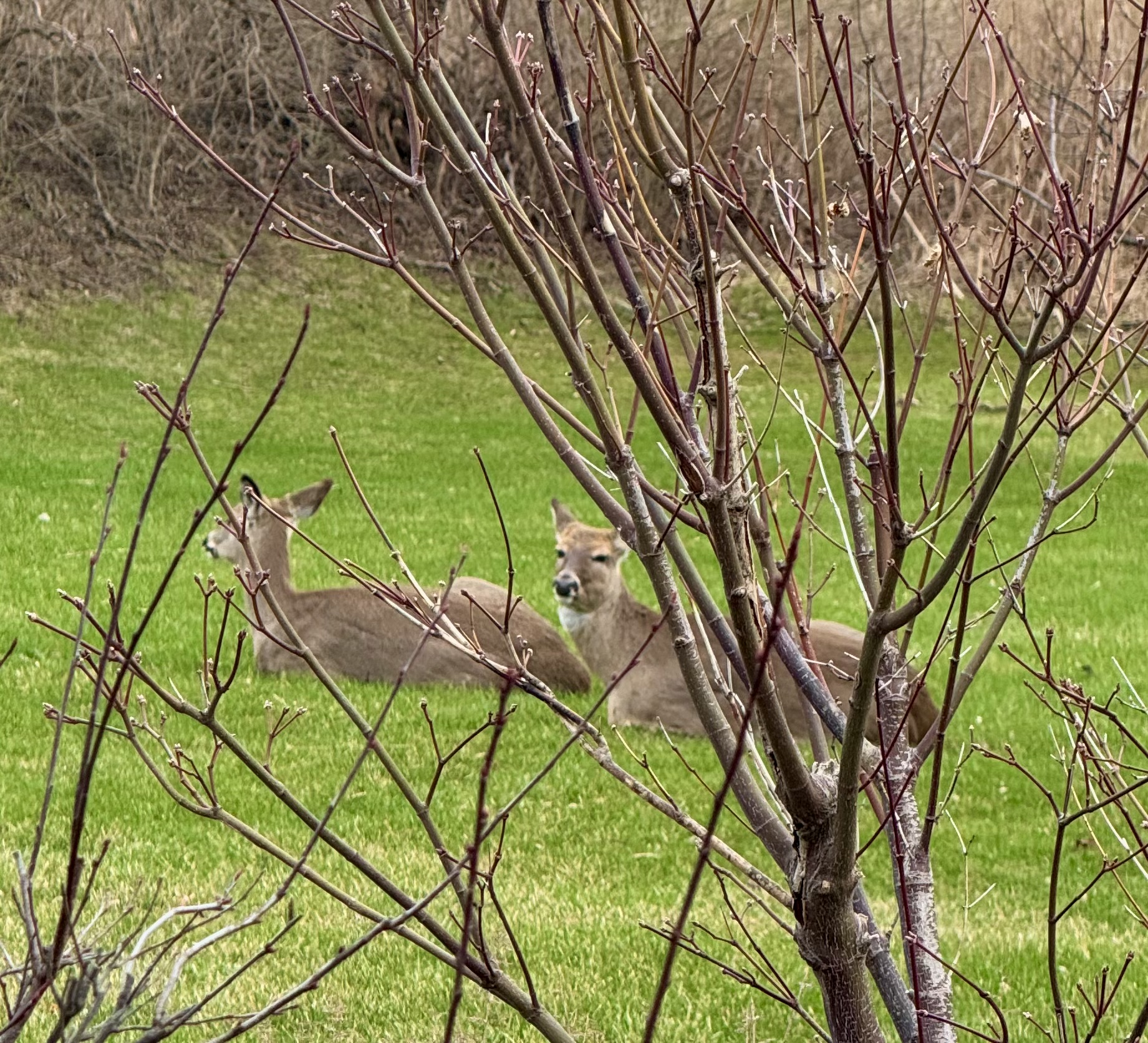 Relaxing and reclining near our cherry tree. One with her eyes on me, wondering if I was about to disturb their respite and the other with eyes fixed on the field, on the lookout for coyotes, perhaps? They’ve been out during daylight hours recently, which is concerning.