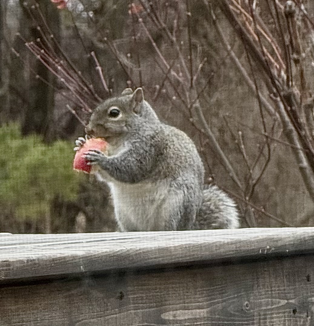By the time I cut the apple into chunks (foregoing the mushy parts because I didn’t feel right sending mush into the yard for any creature) my squirrel friend, Henry, was waiting (see pic above). He’s pretty photogenic, huh?