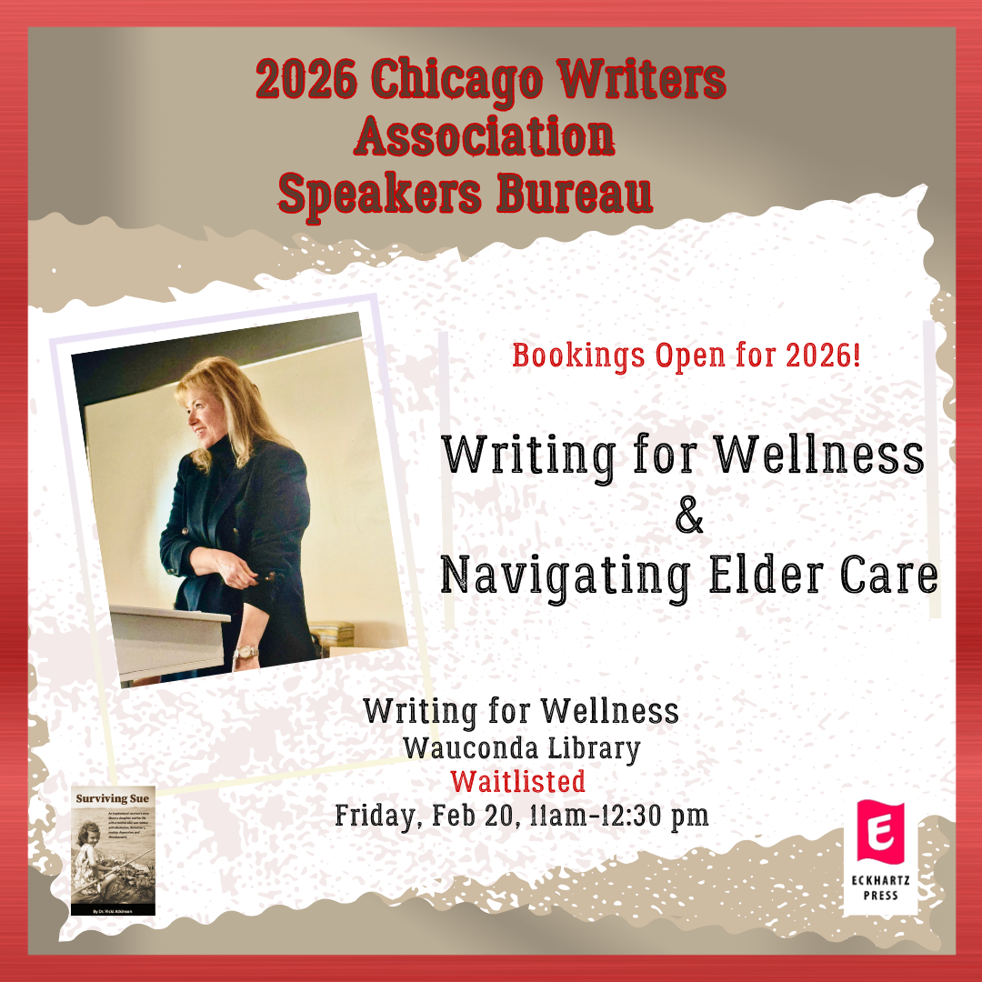 I’m honored again this year to have two offerings – Writing for Wellness and Navigating Elder Care – in the Chicago Writers Association’s Speakers Bureau.
